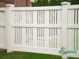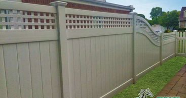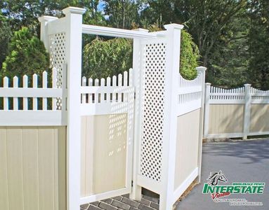 Oklahoma full privacy vinyl can be ordered with an Old English lattice topper. The topper can also be scalloped or crowned to suit your needs. We also offer two-tone vinyl fences. Available in White, Tan, Adobe, Cedar.