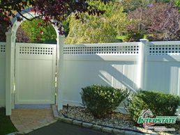 Oklahoma full privacy vinyl can be ordered with deluxe square lattice topper. The topper can also be scalloped or crowned to suit your needs. We also offer two-tone vinyl fences as featured in this picture. Available in White, Tan, Adobe, Cedar.