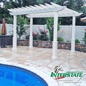 Our Deluxe Pergola is a great addition to any entrance way and can accent your fence or can stand on their own. They are constructed with 2″x6″ rails with decorative “pergola” end caps & 5″x5″ posts. Standard Pergolas are offered with both diagonal & square lattice sides panels as well as custom side panel designs. Pergolas are structurally strong enough to hang a walk gate and can be custom built to fit most gate openings. Available in stock sizes of 3′, 4′ & 5′ wide; they can also be modified to accommodate most custom openings . Available in (4) Colors – White, Tan, Adobe, and Gray.